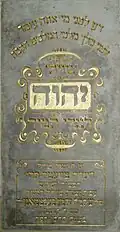 « Cette maison de prières (Beit Ha-Midrash) a été construite à la mémoire des gebbaim (administrateurs et gardiens) de la synagogue: Jakir Singer (Zynger) [qu'il vive longtemps], Chaim Goldstein (Goldsztajn) [qu'il vive longtemps], Alter Neuberg (Nojberg) [qu'il vive longtemps]. En l'année 5688 (=1928) selon le temps intégral. »