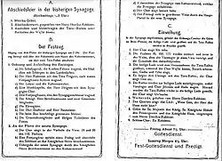 « La récente cérémonie d'inauguration de la synagogue, qui s'est déroulée conformément au programme et de la manière la plus belle et la plus satisfaisante, peut être considérée à juste titre comme une fête d'honneur et de joie pour la communauté israélite et la municipalité de Königshofen. La fête a été introduite par une cérémonie d'adieu dans l'ancienne synagogue. Après la prière de l'après-midi, le rabbin de district, Dr. Kohn de Burgpreppach, a prononcé des paroles d'adieu qui allaient droit au cœur. Le préfet royal du district, accompagné de deux anciens de la commune, ainsi que les représentants des autorités royales étaient présents au grand complet et ont accompagné le cortège, tout comme le clergé, l'administration municipale avec Messieurs le bourgmestre et les adjoints, le maître d'œuvre Valentin Trott et les maîtres artisans qui ont participé à la construction.