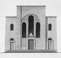 Un majestueux bâtiment de 130 pieds de long sur 72 pieds de large, entièrement en pierre et de style byzantin, situé dans la partie inférieure de la Königstraße et parfaitement visible de tous les côtés, qui sera reconnu par les étrangers et les habitants comme un ornement, non seulement de ce quartier, mais de notre belle ville. Le pignon ouest de la façade principale avec trois entrées à arc plein-cintre, une entrée principale et deux entrées latérales pour les galeries des femmes- une grande baie-fenêtre au-dessus de l'entrée principale; de gracieuses lésènes en pierre de grès bruns taillées, situées sur les côtés, à intervalles de 20 pieds, avec des corniches doubles et des ornements intermédiaires agréables, de même aux quatre coins du bâtiment, des pilastres délimitent les tours rectangulaires; Sur la façade, au-dessus de la baie-fenêtre, s'élève le fronton à angle obtus, au sommet duquel la signification sacrée du bâtiment est proclamée d'une simplicité ingénieuse, en lettres dorées, par les Tables de la Loi. Tout cela donne une impression de la plus grande bienveillance. Les façades latérales de la maison de culte ne paraissent pas moins dignes. Entre les tours d'angle, le toit d'ardoises scintille en pente modérée. Entre les lésènes, les fenêtres à arc plein-cintre complètent le caractère de l'ensemble de la plus belle expression de simplicité et de noblesse…