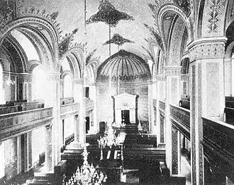 À l'intérieur, sur les deux côtés, trois piliers rectangulaires aux angles arrondis, soutiennent la galerie des femmes. La distance de l'entrée, sans compter le petit vestibule, jusqu'à la grande niche pour l'Arche Sainte, est de 90 pieds, en tout 115 pieds. Les décorations du plafond ne sont pas encore terminées. Les aménagements intérieurs de l'espace, l'emplacement de la chaire, des bancs, etc. font l'objet de discussions entre l'architecte, les anciens de la communauté, le Dr Roman, rabbin du Land et M.. Le Dr Pinhas[3];… »