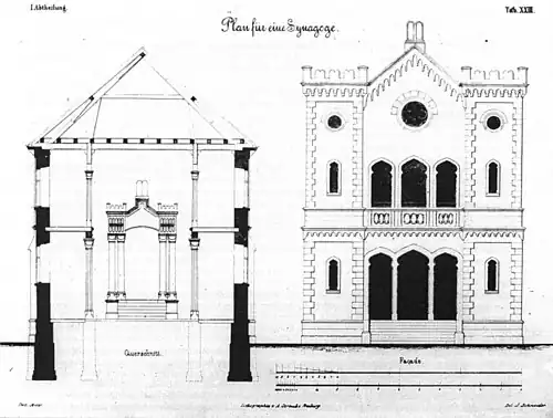 D'après Franz-Josef Ziwes[1], le bâtiment fait 18,41 mètres de long par 10,63 mètres de large et 12,32 mètres de haut. L'ensemble donne une impression de style roman. La façade se compose d'une partie centrale avec un pignon triangulaire surmonté des Tables de la Loi, entourée de deux tours couronnées de créneaux. L'architecte s'est inspiré de la synagogue de Cassel de l'architecte Albert Rosengarten, terminée en 1839.