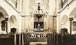 La partie est du bâtiment, de forme rectangulaire, est plus étroite que le corps principal, avec en son centre une petite abside à trois côtés, surmontée d'une gloriette avec un petit dôme mauresque[6]. L'ensemble est inspiré de la synagogue de Bruchsal près de Karlsruhe, et fait référence au Temple de Jérusalem.