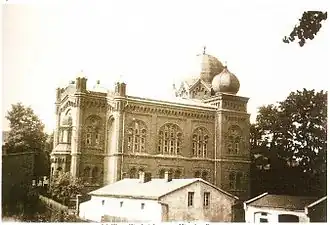 La synagogue en bois détruite par un incendie est remplacée en 1889 par une synagogue en pierre.