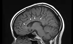 L'IRM cérébrale montre des anomalies de la substance blanche ainsi qu'au niveau du corps calleux[4].