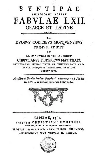 Nous avons sous son nom 62 fables traduites en grec, dont le recueil fut publié la première fois en 1781, à Moscou, par Matttæi, et réédité en France en 1828, par Boissonade.