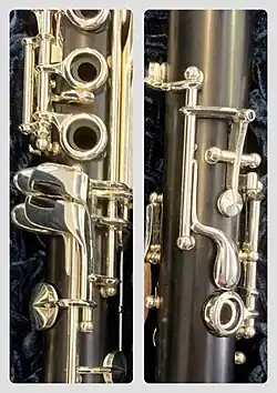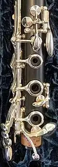 dans le bas du registre clairon) sont équipées de rouleaux à l'intérieur (comme sur les clarinettes Oehler). - 4. La clé de registre a généralement la même forme que sur les clarinettes allemandes, c'est-à-dire que le trou d'harmonie correspondant ne se trouve pas sur la face inférieure de la clarinette mais sur le côté gauche, ce qui nécessite une clé de forme montante au lieu d'une clé droite ; celle-ci peut être combinée avec une clé supplémentaire à ouverture et fermeture automatique pour améliorer la sonorité du si