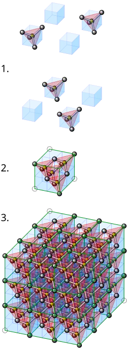 Une autre structure commune est la structure "blende" (ou "blende de zinc"), nommée d'après le minéral blende (sphalérite). Comme la structure "sel", les deux types d'atome forment deux structures cubiques à faces centrées interpénétrées. Cependant, elle diffère de la structure "sel" par la façon dont les deux structures sont positionnées l'une par rapport à l'autre. La structure blende a une coordinence tétraédrique : les quatre plus proches voisins de l'atome d'un type sont des atomes du type opposé, positionnés comme les quatre arêtes d'un tétraèdre régulier. Globalement, la disposition des atomes de la structure "blende" est la même que celle de la structure cubique diamant, mais avec des types d'atome alternés sur les positions des atomes de carbone directement liés dans le diamant[12].