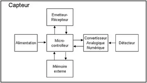 Le capteur constitue la partie matérielle que doit gérer le système d’exploitation[11]. Un capteur, ou nœud, est composé de plusieurs éléments ou modules correspondant chacun à une tâche particulière d’acquisition, de traitement, de stockage ou de transmission de données. Il comprend également une source d’énergie[12],[13].