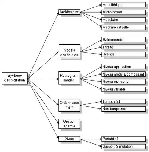 Un état de l'art de mai 2010 recense les principaux systèmes d'exploitation pour capteur en réseau et décrit les solutions apportées par chacun pour optimiser la gestion énergétique des capteurs. Une classification des différents systèmes d'exploitation est également dressée[19]. L'article de 2007 complète celui de 2010 en décrivant d'autres systèmes d'exploitation tombés en désuétude mais intéressants concernant les stratégies utilisées pour optimiser la consommation d’énergie des capteurs[39]. Enfin, deux autres articles, de 2010[40] et 2011[41], font le point sur les versions récentes de ces systèmes. Ces articles font ressortir cinq systèmes d'exploitation - TinyOs, Contiki, Mantis, Nano-RK, et LiteOS - sur lesquels nous expliciterons plus en détail les stratégies développées. Le type d'architecture utilisé pour les systèmes d'exploitation qu'il soit à noyau monolithique, micro-noyau, modulaire ou machine virtuelle, a un impact direct sur la taille du noyau, son empreinte mémoire. L'architecture monolithique permet de réduire cette empreinte au détriment de la simplicité d'utilisation. L'architecture en machine virtuelle permet une portabilité simplifiée du système d'exploitation, le rendant plus flexible sur différents capteurs mais au détriment de la performance. L'architecture modulaire, quant à elle, permet une simplicité d'utilisation et de compréhension, mais la flexibilité[42] en pâtit. Par rapport aux systèmes monolithiques, les micro-noyaux répondent à un besoin de modularité, de flexibilité et de sécurité (Liedtke, 1996). La performance des mécanismes de communication entre les serveurs est au cœur de la conception de tous les micro-noyaux. L'inconvénient majeur réside dans le fait que tout mécanisme de reconfiguration dynamique est à inclure par le concepteur au-dessus de ces services.
