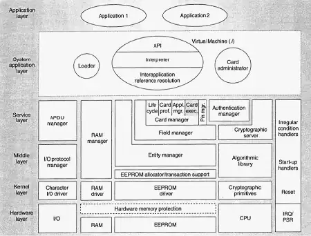 Si les logiciels embarqués dans les cartes programmaient directement le matériel, au début des années 1980, la gestion du matériel a progressivement été isolée du code applicatif. Dans les années 1990 les machines virtuelles ont été utilisées pour présenter une abstraction simplifiant l'utilisation des cartes à puces, notamment avec les technologies Java Card. Enfin, dans les années 2000 les premiers mécanismes d'hypervision basés sur des exo-noyaux ont été expérimentés sur les cartes à puces[17]. De nombreux travaux ont consisté à sécuriser le code mobile qui pouvait être chargé dans la carte[18] afin d’assurer l’intégrité et la confidentialité des données. Cependant, établir des garanties plus larges comme le contrôle des ressources ou le temps réel reste une question ouverte[19].