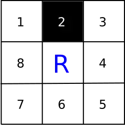 Numérotons de 1 à 8 les actions possibles, le chiffre correspondant à la case sur laquelle le robot doit se déplacer.