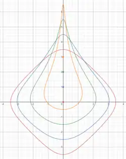 Tous les points de H, et même la plupart des points à l'infini, ont des coordonnées axiales, mais un couple de nombres (x,y) ne correspond à un point de H que si ; si , le couple correspond à un point à l'infini, et les couples tels que ne correspondent à rien. Ainsi, le système des coordonnées axiales définit une injection de H vers le plan , dont l'image (l'ensemble des points (x,y) tels que ) est une région ressemblant à une astroïde, représentée en rouge ci-contre.