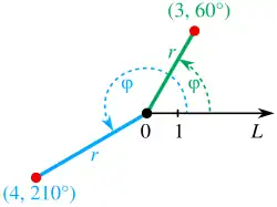 Les coordonnées polaires sont définies dans le plan hyperbolique de la même manière que les coordonnées polaires usuelles : un point de référence O (appelé le pôle) et une demi-droite Ox issue de ce point (appelé l'axe polaire) définissent un repère polaire ; chaque point P est repéré par sa distance au pôle (appelée coordonnée radiale ou rayon) et par l'angle (appelé coordonnée angulaire ou angle polaire).