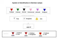 Les badges des camps de concentration nazis font partie du système d'identification dans les camps allemands. Ils sont utilisés dans les camps de concentration par le régime nazi pour identifier la raison pour laquelle les prisonniers y sont emprisonnés[1]. Les triangles sont en tissu et cousus sur les vestes et les pantalons des prisonniers. Ces insignes de la honte obligatoires avaient des significations spécifiques indiquées par leur couleur et leur forme. Ces emblèmes aidaient les gardiens à assigner des tâches aux détenus. Par exemple, un garde pouvait voir en un coup d'œil si quelqu'un était un criminel condamné (insigne vert) et donc probablement d'un tempérament dur adapté à la fonction de kapo.