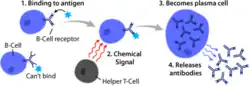 Si l'inflammation n'est pas contrôlée par le système inné, les lymphocyte T4 vont activer les lymphocytes B spécifiques au microbe à l'aide d'une cytokine, l'interleukine 2. Les lymphocytes B vont alors produire des anticorps.