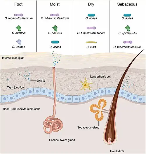 - ↑ (en) Elizabeth A. Grice et Julia A. Segre, « The skin microbiome », Nature Reviews Microbiology, vol. 9, no 4, , p. 244–253 (ISSN 1740-1526 et 1740-1534, PMID 21407241, PMCID PMC3535073, DOI 10.1038/nrmicro2537, lire en ligne, consulté le )
