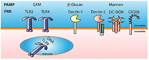 Les principales classes de PRR associées aux cellules identifiées sont les récepteurs Toll-like (TLR), les lectines de type C, les récepteurs peptidiques formylés Met-Leu-Phe, les récepteurs scavenger, les NLR et les protéines de la famille CARD.