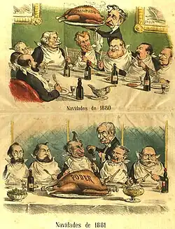 D'autre part, « la possibilité d'un accord dérivait du parallélisme existant dans les bases sociales — les classes propriétaires — des deux partis de la 'famille libérale'. Un parallélisme qui s'accentua au fil du temps dans ses principes essentiels jusqu'à ce que les deux deviennent indistinguables sur l’essentiel »[136]. De fait, certains politiciens pouvait changer de parti sans que cela pose de problème idéologique, comme Antonio Maura qui commença au parti libéral et finit par diriger le camp conservateur[137]. Quand on reprocha à un cacique de soutenir tantôt les libéraux et tantôt les conservateurs aux élections, il répondit : « Me changer ? Je ne change jamais. Celui qui change, c'est le gouvernement. Moi, je suis toujours avec celui qui est au gouvernement »[138].