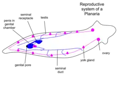 Toutes les planaires sont hermaphrodites : leur système reproducteur comporte donc une partie mâle et une partie femelle. Les deux parties communiquent avec la surface du corps par une seule ouverture appelée gonopore, qui est située sur la face ventrale de la moitié postérieure du corps.