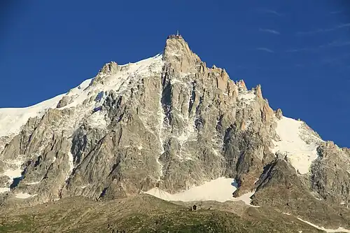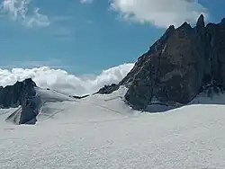 Depuis le glacier des Bossons avec l'aiguille du Midi au centre et le pylône intermédiaire à gauche.
