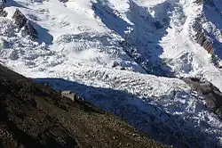 Ruines du chalet de Pierre Pointue au-dessus du glacier des Bossons.