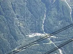 Depuis le glacier Rond avec l'arrivée au centre et le pylône intermédiaire à gauche.