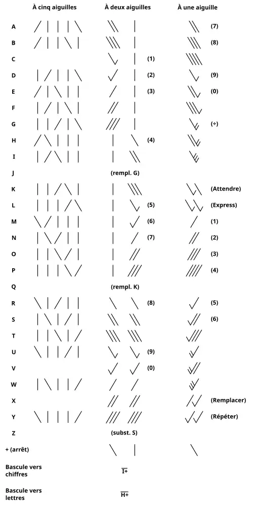) sont marqués sur les plaques des télégraphes à aiguilles ultérieurs, ainsi que des codes à six unités pour la bascule aux chiffres (