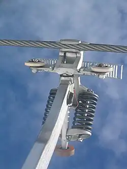 La tête du pylône se présente face à la ligne et reçoit, de part et d'autre, un balancier articulé regroupant une série de galets. La longueur du balancier (et donc le nombre de galets qui le composent) dépend de sa charge, qui est, en grande partie, fonction du changement de pente de la ligne au niveau du pylône. On trouve des balanciers dits de support, destinés à porter le câble, mais également des balanciers de compression qui rapprochent la ligne du sol fini, par exemple pour respecter les limitations légales de hauteur de survol des sièges ou assurer une reprise de pente[11]. Il existe par ailleurs des balanciers de support-compression, destinés à accompagner un profil de ligne légèrement concave lorsque, en fonction de la charge, l'appui du câble sur la partie support ou compression n'aurait pas été permanent[11].