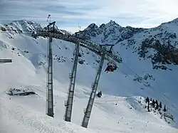 Un télésiège est un téléporté dit monocâble[1] : un unique câble se charge à la fois de porter et tracter les véhicules. Celui-ci forme une boucle fermée qui circule suivant un mouvement unidirectionnel continu. Il est soutenu sur sa ligne par plusieurs pylônes métalliques, via des galets de roulement sur lesquels repose le câble. Les pylônes se présentent généralement sous la forme d'une structure tubulaire monopode, d'un diamètre compris entre 0,70 et 2,50 mètres[11]. Certains télésièges disposent cependant de pylônes en treillis, en particulier, les installations anciennes, dont les éléments de lignes ont été pensés pour un montage exclusivement manuel, avec transport de la structure de façon terrestre, par petite partie, là où l'on utilise maintenant la technique de l'héliportage. Le fût d'un pylône repose sur un massif béton sur lequel il est généralement boulonné via des tiges d'ancrage filetées (parfois la base est noyée dans le massif même). L'inclinaison et la hauteur des pylônes varient en fonction du relief et des réglementations locales de survol maximum[notes 3]. Un pylône de télésiège atteint généralement une dizaine de mètres, toutefois, quelques-uns situés sur de courtes dépressions de niveau de survol, dépassent parfois la vingtaine de mètres[11].