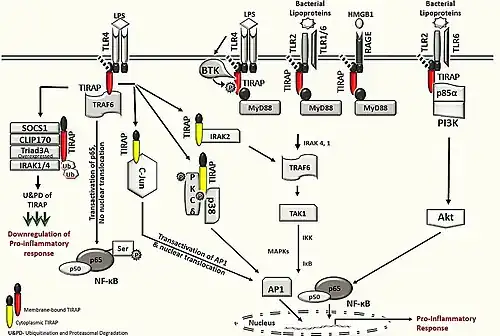 Le recrutement du TIRAP au niveau de la membrane plasmique se produit lors de la liaison à PIP2 avant son interaction avec les TLR[9]. TIRAP est ensuite phosphorylé par la tyrosine kinase de Bruton, ce qui facilite son interaction avec le domaine TIR des TLR et par conséquent MyD88 pour initier le signal de transduction[7].