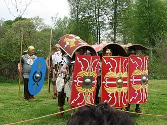 - Au commandement testudinem formate, les légionnaires formaient la tortue. Cette formation était lente mais offrait une excellente protection contre les flèches et étaient donc utilisée lors des sièges ou en face d'archers. Elle était cependant peu efficace en combat rapproché et elle n'était utilisée que lorsque l'ennemi était suffisamment loin pour pouvoir adopter une autre formation avant le combat.