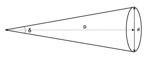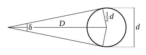Un objet ayant une dimension d dans une orientation perpendiculaire à la direction de l'observation, vu centré à une distance D, intercepte un angle δ. La moitié de la dimension de l'objet et les droites qui joignent la position de l'observateur au milieu de l'objet et à une de ses extrémités forment un triangle rectangle, dont l'angle au point d'observation est la moitié de δ, et pour lequel, par définition,