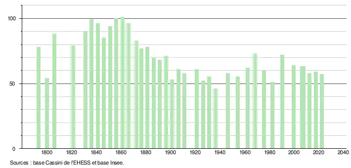 L'évolution du nombre d'habitants est connue à travers les recensements de la population effectués dans la commune depuis 1793. Pour les communes de moins de 10 000 habitants, une enquête de recensement portant sur toute la population est réalisée tous les cinq ans, les populations de référence des années intermédiaires étant quant à elles estimées par interpolation ou extrapolation[31]. Pour la commune, le premier recensement exhaustif entrant dans le cadre du nouveau dispositif a été réalisé en 2007[32].