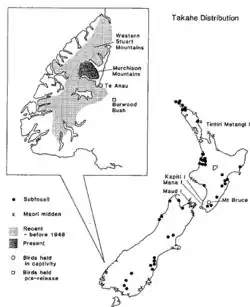 Répartition des takahēs du Sud en 1984 en Nouvelle-Zélande