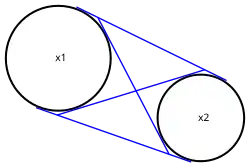 - si les cercles se croisent en deux points (|r1 – r2| < d < r1 + r2), alors il n'y a aucune bitangente intérieure et seulement deux bitangentes extérieures (elles ne peuvent ps être séparés car elles se croisent, donc pas de bitangente intérieure).