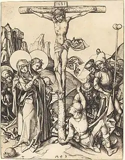 La scène de l’Annonciation prend une forme classique inspirée de la peinture flamande du XVe siècle : Marie et l’ange Gabriel se font face dans un intérieur représenté en perspective, séparés par le vase de lys, tandis que la colombe du Saint-Esprit descend sur Marie. La Crucixion est elle probablement inspirée de l’art de Martin Schongauer, avec là aussi une composition assez classique : les Saintes Femmes et l’apôtre Jean se répartissent de chaque côté de la croix, au pied de laquelle les soldats se partagent la tunique de Jésus aux dés[6].