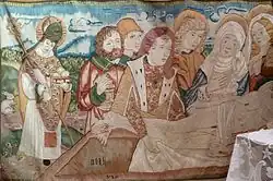Proéminent à l’avant-plan se trouve le tombeau, dans lequel Joseph d’Arimathie et Nicodème sont en train de descendre le corps de Jésus. Entre eux se trouve un groupe parmi lequel Marie, qui semble sur le point de défaillir, la main sur le cœur, tient le rôle central. À sa droite, l’apôtre Jean l’observe et paraît être sur le point de la retenir, tandis qu’à sa gauche Marie Madeleine, les mains jointes, prie ardemment. À gauche Zachée apporte un flacon de parfum, accompagné d’un personnage indéterminé qui se tient derrière lui[4]. Au sein de cette iconographie relativement classique, la présence de saint Nicolas sur le côté gauche semble quelque peu incongrue. Derrière lui s’ébat un lapin et s’étend un paysage de champs dans lesquels s’activent des paysans, tandis qu’à l’arrière plan les montagnes ressemblent fortement aux hauteurs de Dabo, visibles depuis l’abbaye[5].