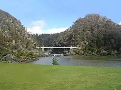 Le Tarkine, situé au nord-ouest, est la plus grande forêt humide tempérée d'Australie et une des plus étendues au monde couvrant environ 3 800 km2[15]. Avec sa topographie accidentée, la Tasmanie a un grand nombre de rivières, qui sont presque toutes coupées par des barrages pour fournir de l'électricité pour les besoins de l'État. La plupart des rivières prennent leur source dans le Massif central et s'écoulent vers les côtes. Les estuaires de Tasmanie (portant souvent le nom de « rivière ») sont des lieux de regroupement de population. La Derwent River s'écoule vers le sud-est et atteint la côte à Hobart, la Tamar s'écoule vers le nord à partir de Launceston, la Mersey River s'écoule vers le nord et le nord-ouest à Devonport et les rivières Franklin et Gordon s'écoulent vers l'ouest et arrivent sur la côte à Strahan. La South Esk River est le plus long cours d'eau de Tasmanie. Elle prend sa source dans les montagnes près de Fingal et traverse Avoca, Evandale, Longford, Hadspen et finalement Launceston avant de rejoindre la North Esk River pour former la Tamar. Le cours de la rivière est barré par le Trevallyn Dam près de Launceston, barrage qui sert à fournir de l'électricité à la ville. Bien que la majeure partie de l'eau stockée dans le lac Trevallyn soit utilisée par la centrale, l'excédent s'écoule dans la Cataract Gorge avant de rejoindre aussi la Tamar[16].