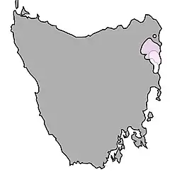Cette espèce est endémique de Tasmanie : elle se rencontre au nord-est de l'île sur un territoire de 600 km2[1].