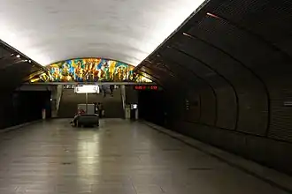 La station dispose : d'un bâtiment, avec entrée et sortie, qui est équipé d'un guichet et d'automates, et au nord deux bouches couvertes donnant sur un hall en sous-sol avec automates et tourniquets[4].