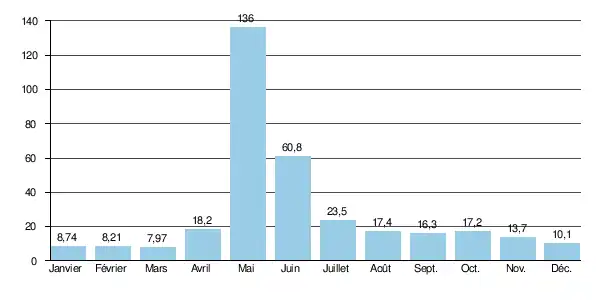 En ce qui concerne la période libre de glaces (de mai à octobre inclus), le débit minimal observé a été de 9,65 m3/s en , ce qui restait par ailleurs assez confortable.
