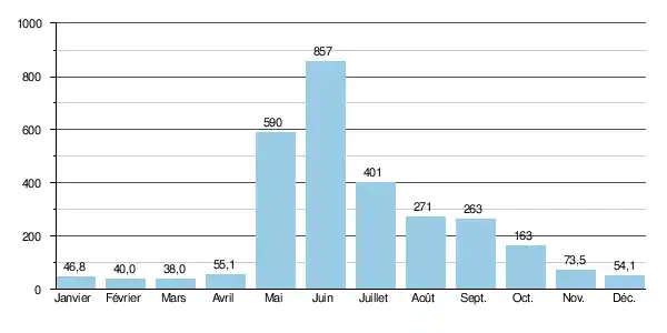 Le débit moyen mensuel observé en mars (minimum d'étiage) est de 38,0 m3/s, soit plus ou moins 4,5 % du débit moyen du mois de juin (857 m3/s), ce qui souligne l'amplitude élevée des variations saisonnières. Sur la durée d'observation de 10 ans, le débit mensuel minimal a été de 18,5 m3/s en , tandis que le débit mensuel maximal s'élevait à 1 520 m3/s en .