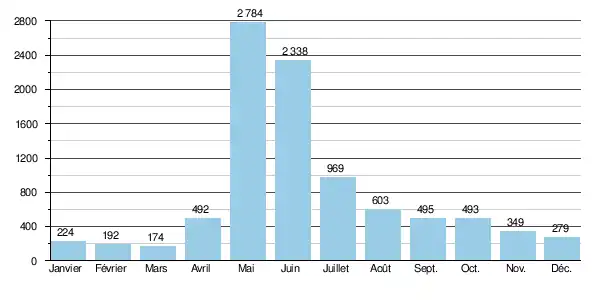 En considérant la seule période estivale, libre de glaces (de mai à octobre inclus), le débit mensuel minimal observé a été de 261 m3/s en , niveau restant encore très confortable. Un débit mensuel estival inférieur à 280 m3/s est rare, voire exceptionnel.