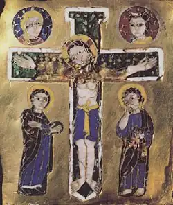 Dès l'Antiquité et durant le haut Moyen Âge, c'est la technique du cloisonnage qui est employée. On part d'une plaque appelée platine dont on soulève les bords pour réaliser une bordure sur laquelle on soude de petites cloisons métalliques ou rubans en forme du dessin que l'on désire réaliser. On constitue ainsi des alvéoles dans lesquelles l'émail sera déposé. L'émail utilisé pour ces époques est translucide, il laisse donc apparaître le fond métallique, souvent rehaussé d'or pour donner plus de brillant. Cette technique, caractéristique de l'Antiquité, perdurera au haut Moyen Âge dans l'Art byzantin dont l'influence s'étend sur toute l'Europe. Un bon exemple, pour l'époque carolingienne est la croix reliquaire du Pape Pascal II, datée du IXe siècle. Il s'agit d'une croix dite "historiée"[5] à émail cloisonné et translucide qui permet de voir le fond fait d'un vert à l'origine brillant. Seul l'émail utilisé dans les cloisons des personnages est opaque pour leur donner plus de consistance. Il y eut beaucoup de ce type d’œuvre autour de l'an 1000 et notamment dans l'empire ottonien du XIe siècle, où l'influence byzantine était importante. On produit alors beaucoup d'émaux dont l'iconographie est soit abstraite soit figurée et surtout dévolue à la vie de la Vierge. Les émaux du trésor de la cathédrale d'Essen en Allemagne en donnent une bonne illustration, l'ensemble est émaillé et tout le réseau des rubans est très repérable. Ces techniques restent peu traduites dans l'Occident roman.
