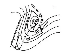 - La différence de hauteur de la 500 hPa pour des points situés à 7,5 degrés de latitude de part et d'autre de la dépression de surface. On mesure perpendiculairement au courant et on n'inclut que les contours ouverts