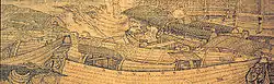 Il existe dans la littérature chinoise de nombreuses descriptions des activités portuaires, du commerce maritime, du commerce extérieur et des navires de commerces eux-mêmes. En 1117, l'auteur Zhu Yu écrit non seulement sur la boussole magnétique, mais également sur une ligne de cent pieds avec un crochet sur le pont du navire, utilisée pour collecter des échantillons de vase au fond de la mer afin que l'équipage puisse en déduire la position du navire en fonction de l'odeur et de l'apparence de la vase[75]. De plus, Zhu Yu décrit des compartiments à cloisons étanches dans la coque des navires afin de se prémunir d'un échouage en cas de dommage de la coque la voile aurique, les voiles tendues sur un mat et la méthode pour battre le vent[76]. Confirmant les écrits de Zhu Yu sur les bateaux à coques compartimentées, un navire datant de 1277 de près de 24 m de long et 9 m de large est découvert en 1973 sous l'eau près de la côte méridionale de la Chine. Cette épave compte 12 compartiments dans sa coque[77]. La culture maritime durant la période de la dynastie Song est accrue par ces nouvelles technologies, qui permettent un plus grand trafic sur les rivières et canaux. Celui-ci est animé par les navires gouvernementaux transportant les impôts en grain, les navires et barges de tributs, les navires marchands privés, une multitude de pêcheurs dans de petits bateaux de pêche et les confortables et luxurieux yachts privés des plus riches[78].