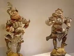 Dans le domaine de la céramique, c'est sous la dynastie Tang qu'est inventée la technique sancai, qui permet de produire des céramiques "trois couleurs". Les sancai sont originaires du nord de la Chine et sont fabriquées en utilisant du kaolin, de l'argile réfractaire et très peu de fer[47]. Pour colorer les sancai, les artisans chinois utilisent différents pigments naturels. Ainsi, le jaune provient de l'oxyde de fer, le vert de l'oxyde de cuivre, le violet du manganèse et le bleu de l'oxyde de cobalt, une matière que les Tang importent du Moyen-Orient via les routes commerciales de l'Asie centrale. C'est également sous les Tang qu'est inventée la céramique vitrifiée et translucide connue sous le nom de porcelaine, même si elle ne prend véritablement son essor que bien après la chute de cette dynastie[48],[49].