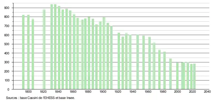 L'évolution du nombre d'habitants est connue à travers les recensements de la population effectués dans la commune depuis 1793. Pour les communes de moins de 10 000 habitants, une enquête de recensement portant sur toute la population est réalisée tous les cinq ans, les populations de référence des années intermédiaires étant quant à elles estimées par interpolation ou extrapolation[26]. Pour la commune, le premier recensement exhaustif entrant dans le cadre du nouveau dispositif a été réalisé en 2008[27].