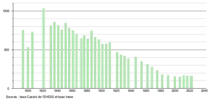 L'évolution du nombre d'habitants est connue à travers les recensements de la population effectués dans la commune depuis 1793. Pour les communes de moins de 10 000 habitants, une enquête de recensement portant sur toute la population est réalisée tous les cinq ans, les populations de référence des années intermédiaires étant quant à elles estimées par interpolation ou extrapolation[20]. Pour la commune, le premier recensement exhaustif entrant dans le cadre du nouveau dispositif a été réalisé en 2006[21].