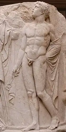 Seule l'une d'entre elles est en bon état[17]. Elle représente un jeune homme nu ailé qui, si ce n'était son épée, pourrait être un Éros. Un autre jeune homme nu, portant un manteau sur le bras, est facilement reconnu comme Hermès grâce au caducée qu'il tient dans la main droite. Les deux jeunes gens sont entourés de femmes portant le péplos ; un personnage masculin très mutilé est représenté assis et porte des sandales au dessin élaboré.
